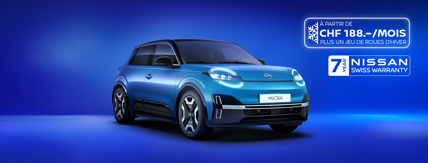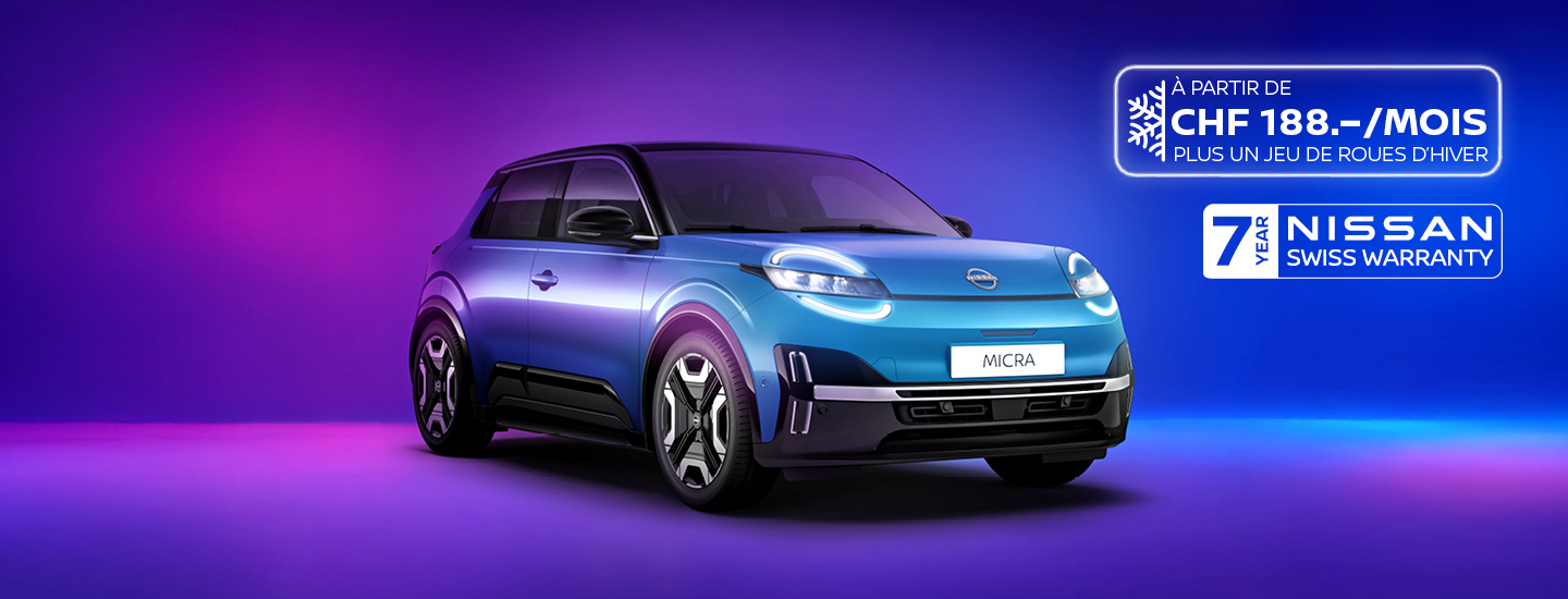 Exemple de leasing: All New Nissan MICRA, Engage, 120 PS 42 kWh ; prix catalogue CHF 28’200, avec 7 ans de garantie Nissan Swiss Warranty et jeu de roues d’hiver inclus; durée 60 mois, kilométrage 10’000 km/an, taux annuel nominal 2.9%, taux annuel effectif 2.94%, apport CHF 8’823.-, valeur résiduelle CHF10’152.-; mensualité à partir de CHF 188.-/mois hors assurance casco complète obligatoire. L’octroi d’un crédit est interdit s’il est susceptible d’entraîner le surendettement du preneur de leasing. Prix TVA incl., sous toute réserve de modifications. Offre valable du 29.10.2025 - 31.12.2025, uniquement chez les agents Nissan participants en Suisse. Financement par Mobilize Financial Service est une marque commerciale de RCI Finance SA. Les véhicules d’importation directe ne sont pas concernés par la promotion.
