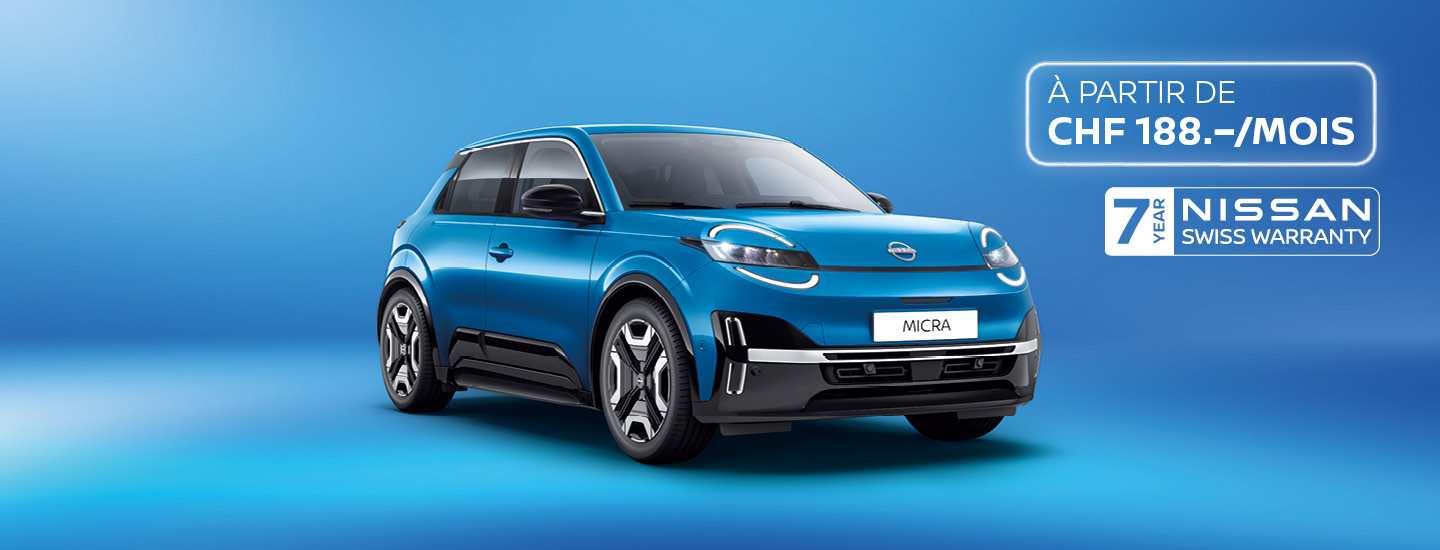 Exemple de leasing: All New MICRA Engage, BEV 40 kWh 122 ch, prix catalogue Fr. 28’200.–, 7 ans de Nissan Swiss Warranty offerts; durée 60 mois, kilométrage 10’000 km/an, taux annuel nominal 2.90%, taux annuel effectif 2.94%, apport Fr. 8’919.–, valeur résiduelle Fr. 10’152.–; mensualité à partir de Fr. 188.–/mois, assurance casco complète obligatoire non comprise. L’octroi d’un crédit est interdit s’il est susceptible d’entraîner le surendettement du preneur de leasing. Prix TVA incl., sous réserve de modifications. Offre valable du 01.01.2026 au 28.02.2026, uniquement chez les agents Nissan participants en Suisse. Financement via Mobilize Financial Services, une marque de RCI Finance SA.