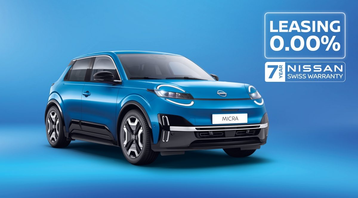 Exemple de leasing (uniquement pour les clients privés) : Nissan MICRA, ENGAGE, 40 kWh 122 ch (90 kW) ; Prix catalogue CHF 28’200.–, déduction faite de la prime Nissan de CHF 1’000.– ; Consommation d’énergie : 15,8 kWh/100 km, émissions de CO₂ : 0 g/km, émissions de CO₂ liées à la mise à disposition de l’électricité : 18 g/km, catégorie d’efficacité énergétique : B ; Durée : 48 mois ; kilométrage annuel : 10’000 km/an ; taux d’intérêt nominal annuel : 0,00 %, taux d’intérêt effectif annuel : 0,00 % ; Acompte CHF 8’560.–, valeur résiduelle CHF 12’408.– ; Loyer mensuel dès CHF 259.–/mois, assurance casco complète obligatoire incluse, ainsi que l’assurance GAP et l’assurance de protection des paiements Protect Lease. L’offre est valable uniquement en cas de conclusion simultanée d’une assurance casco complète obligatoire (assureur : Zurich Compagnie d’Assurances SA). L’octroi de crédit est interdit s’il entraîne le surendettement du consommateur. Prix TVA incluse. Sous réserve de modifications de prix. Valable uniquement auprès des partenaires Nissan participants en Suisse.